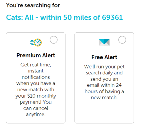 Our adoptable animals are uploaded to Adopt-a-Pet through the database we use. If you can't find the type of animal you are searching for (specific breed, age, size, color, etc.) you can easily set up an alert through Adopt-a-Pet. There are two options: a free alert, which your search will be run once a day and you will receive an email within 24 hours of having a new match. Or, you can sign up for Premium Alerts and get real time instant notifications with a new match for $10 a month. (You can cancel at any time.)